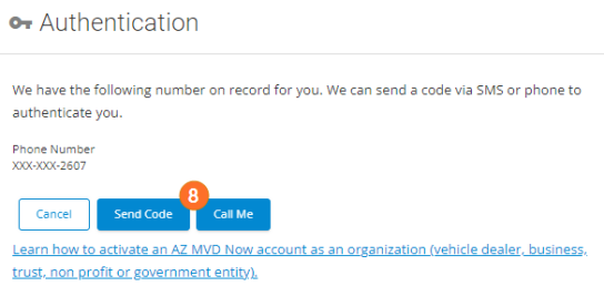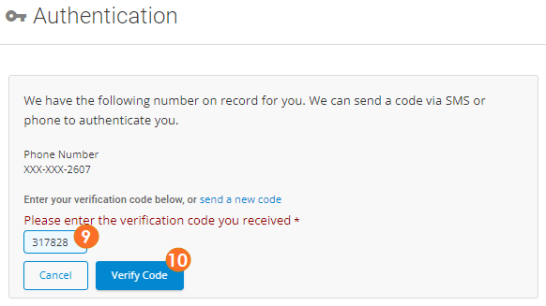 - An Authentication screen will display with the last 4 digits of the phone number we have on file for your account. Click Send Code or Call Me.