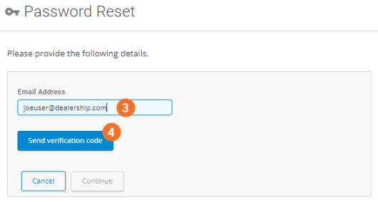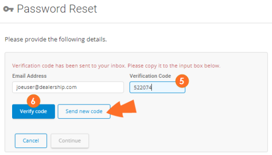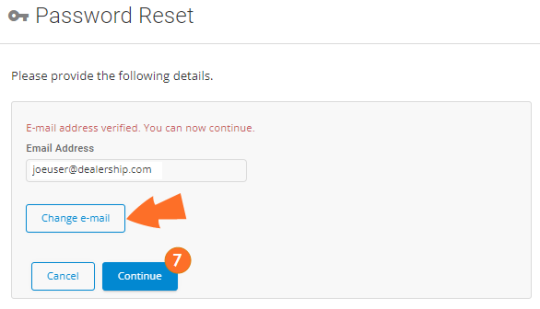 The Password Reset screen will update to confirm the code has been verified and allow the customer to optionally change their email address.
