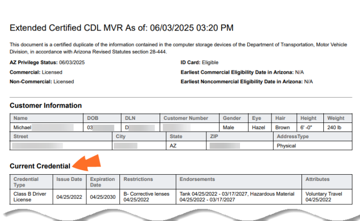 The Current Credential section will list the Class and any restrictions, endorsements, or attributes.