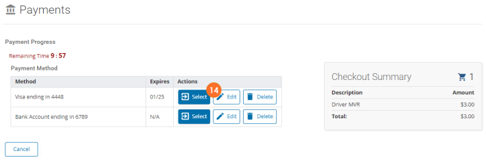 - If a Payment Method is already saved, click Select to select that payment method.