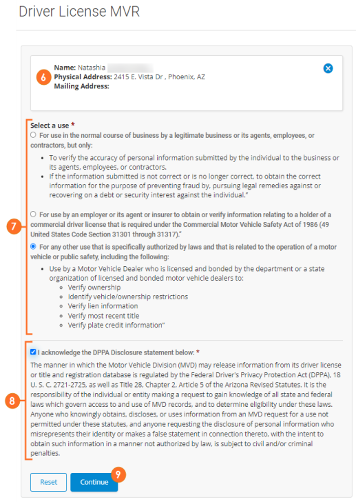 - Read and acknowledge you are authorized and you have a permissible reason for requesting the MVR. Check the applicable acknowledgment checkbox.