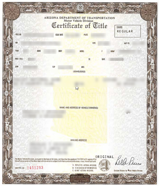 The back of a current Arizona title is similar to the back of an Arizona title printed from 1991- April 2020. |