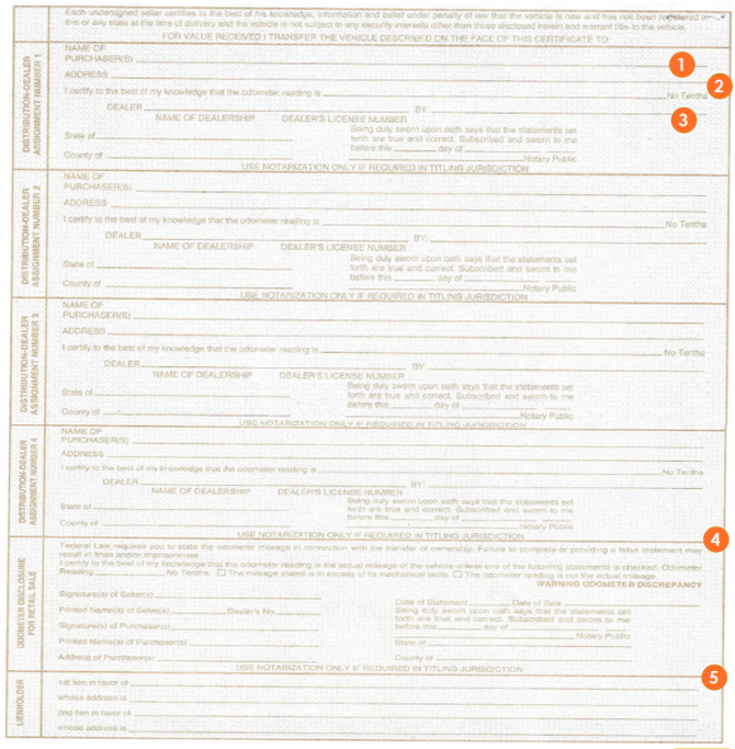 - Dealership's name; their corresponding license number (if not provided, signatures must be notarized); signature of the employee authorized to sign for the dealership