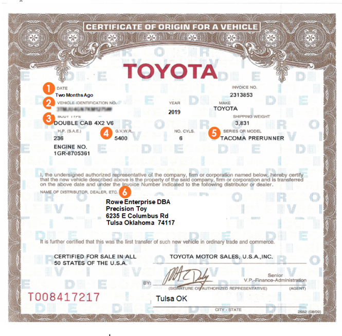 - Dealership name or the purchaser's name, if the purchaser purchased the vehicle directly from the manufacturer